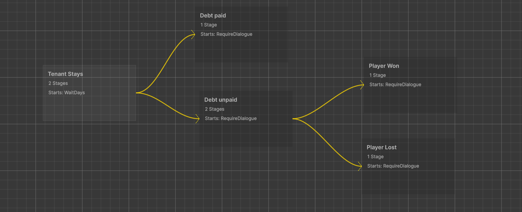 The quest system is stages-based and supports multiple activity types including defeating NPCs, dialogue completion, and resource collection. I also built an editor tool for visualization and creation.